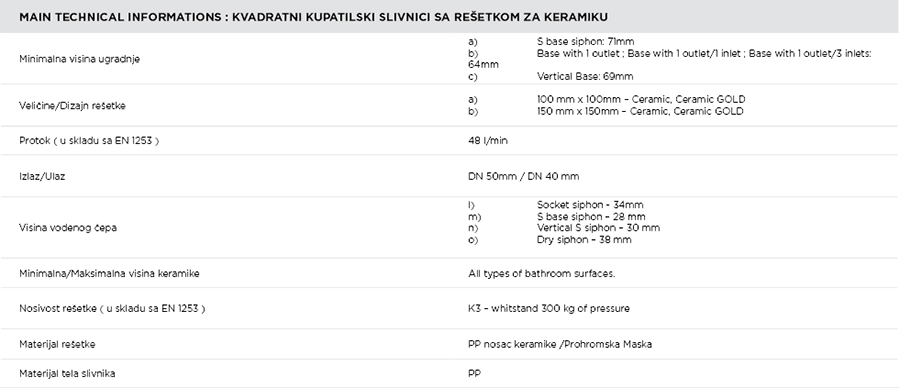 Peštan公司其Confluo標(biāo)準(zhǔn) - 浴室地漏與光柵為不同大?。?00毫米x 100在100mm和150毫米×150毫米),爐篦(陶瓷和陶瓷金),6種不同的堿(用1個輸出水平基座的不同設(shè)計的2,水平基座的陶瓷產(chǎn)品2用1次1的輸入/ 1輸出,水平基座3輸入/ 1輸出,其基極為40mm水柱,其基極用30mM水溶液塞子,垂直堿)和3種不同類型虹吸(虹吸在基于S-,干虹吸帽密封的)所有堿基Confluo標(biāo)準(zhǔn)模型具有DN和DN輸出50毫米40毫米盡可能多的48升/分鐘的流速進(jìn)入。從74毫米最低高度毫米到95毫米視型號而定。