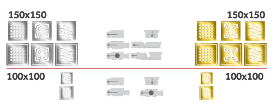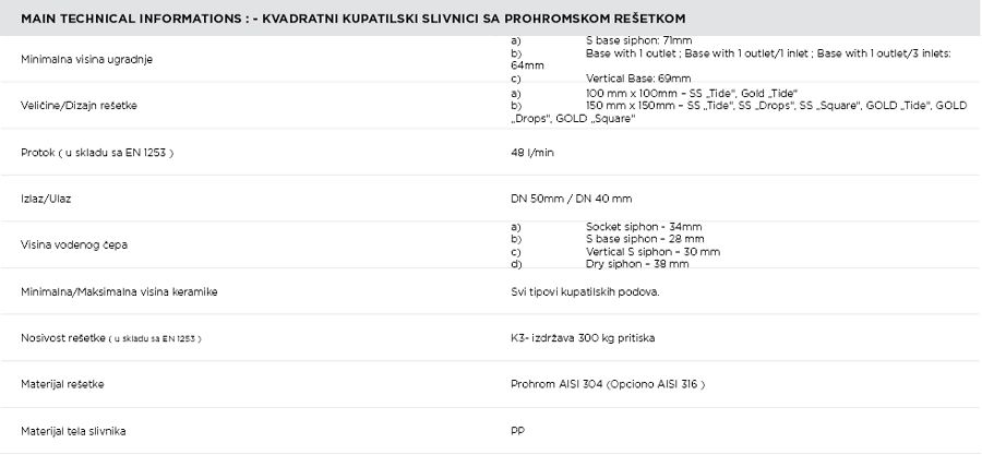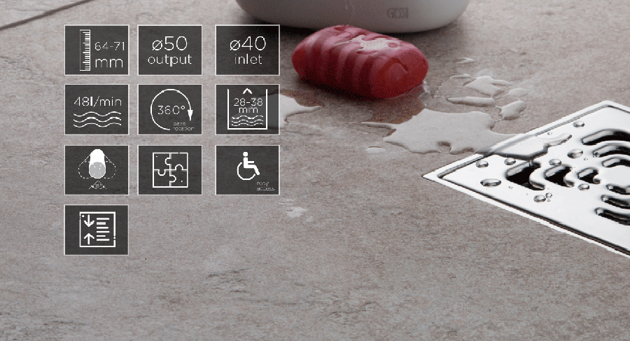 Peštan公司及其Confluo標衛(wèi)浴在2種不同尺寸(100毫米x 100在100mm和150毫米×150毫米),6個不同的設(shè)計光柵可水渠(Prohrom“潮”不銹鋼“滴”不銹鋼“廣場”金“潮”黃金“滴“金”廣場“),6種不同的堿(水平基座1個輸出,與1點的輸入/輸出1水平基部,水平基座3的輸入/輸出1,其基為40mm水柱,其基極用30mM水溶液螺柱,垂直堿)和3種不同類型虹吸(在-S為主虹吸,干虹吸管虹吸杯)的。所有基地Confluo標準模型具有DN和DN輸出50毫米40毫米與高達48升/分鐘的流速進入。從74毫米最低高度毫米到95毫米視型號而定。
